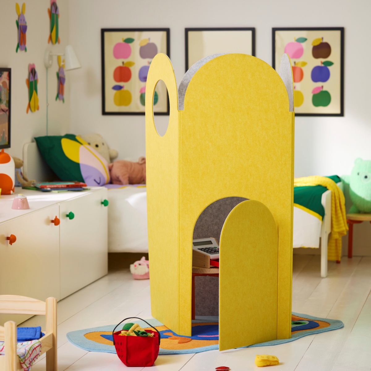鮮黃色的GREJSIMOJS間隔屏風,以耐用毛氈布製成,門片、洞孔搭配可折疊設計使用更靈活,即使家中兄弟姊妹共用空間,也能變出各自的小基地。