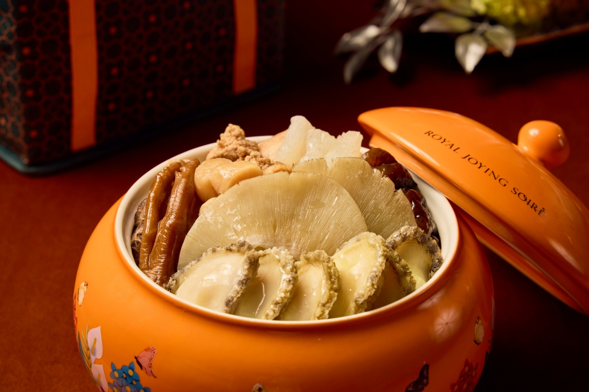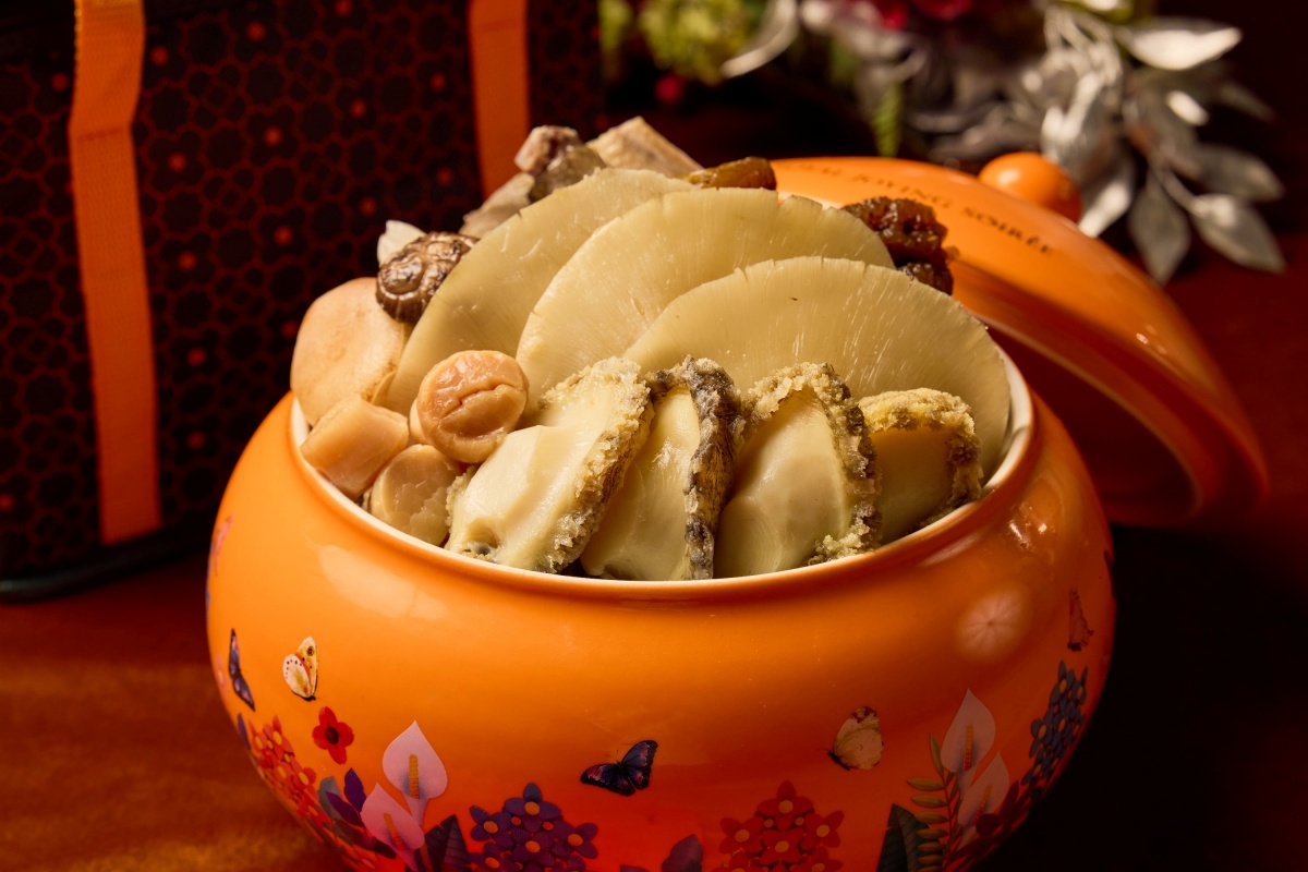 象徵福壽全歸的佛跳牆為年節餐桌必享美饌,主廚獻上台式及港式兩種風味,將鮑參翅肚山珍海味收攏甕中。訂製款瓷甕明艷亮橘搭配花鳥圖騰,貴氣十足,為團圓餐桌增色,兼具環保概念可重複使用。