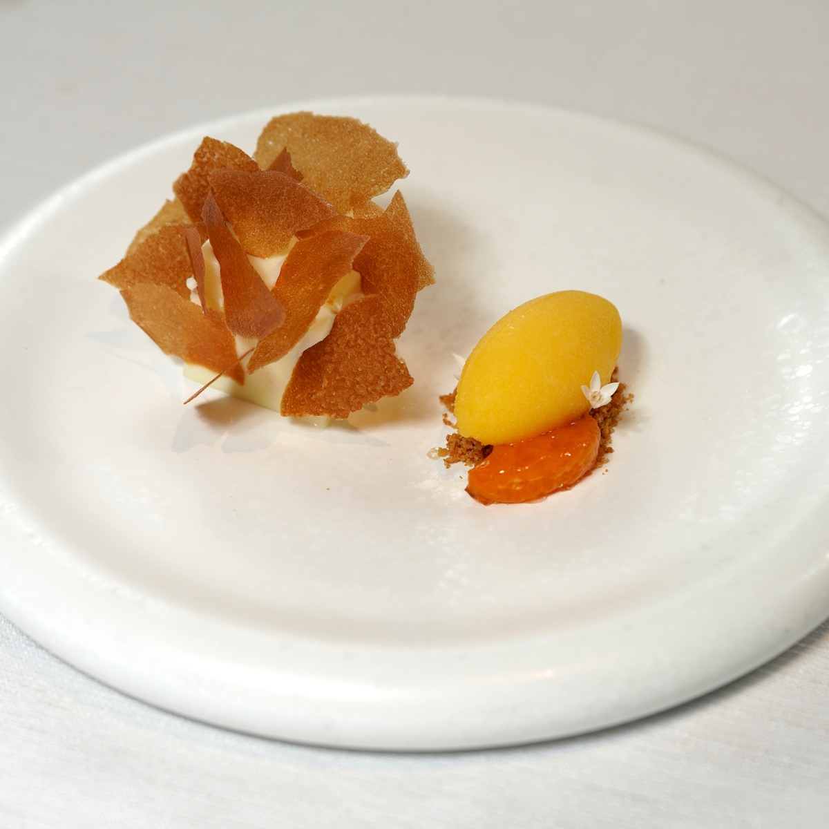經過長時間多方測試,Chef Sato推出這份新菜單,期待能夠滿足饕客的味蕾,份量剛好且意猶未盡,每道菜的口感與風味都很平衡協調,他表示日本人的美食哲學並不崇尚用餐飽到天靈蓋,因此即使到套餐的最後,他將最愛的起司蛋糕解構,綜合紐約與澳洲的起司蛋糕的優點,以令人驚喜的輕盈口感搭配台灣蜜柑的酸甜,完美地收尾。