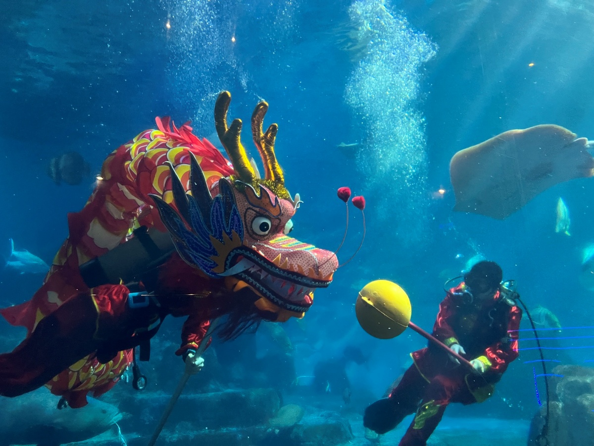 其中,「水下祥龍餵食秀」為全台唯一水下舞龍表演,祥龍在水中翻騰舞動,領著魚群一同拜年,呈現壯觀的新春水下盛宴,象徵好運開演、福氣滿滿。