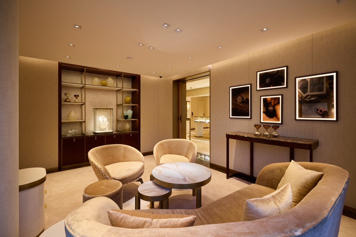 室內空間嚴選多種義大利頂級材質,包括白金與金色調交織的Calacatta大理石、細膩皮革與高級織品,並融入源自品牌經典Belle Époque美好年代系列的幾何裝飾風格。空間中亦可見來自威尼斯穆拉諾島、隸屬於DAMIANI集團的百年玻璃工坊VENINI所打造的家具與燈飾,在傳統工藝與當代設計之間,勾勒出極具層次的藝術氛圍。