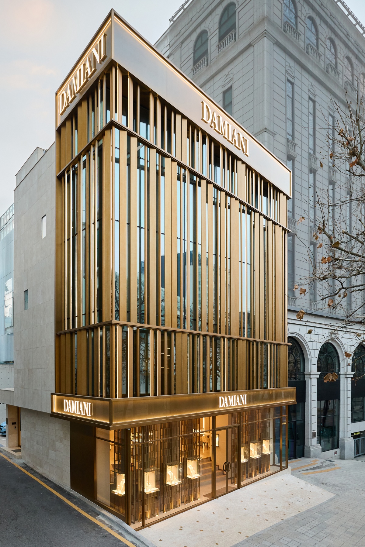 建築外觀同樣展現品牌鮮明識別。立面以標誌性的香檳金色調為主軸,垂直線條隨光線變化而呈現不同表情,猶如珠寶在光影中流轉的璀璨光澤,呼應DAMIANI對光線掌握的非凡工藝。