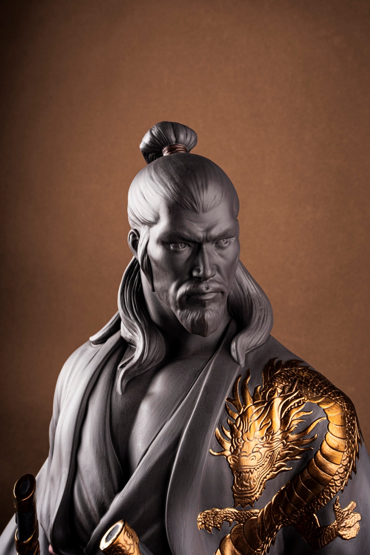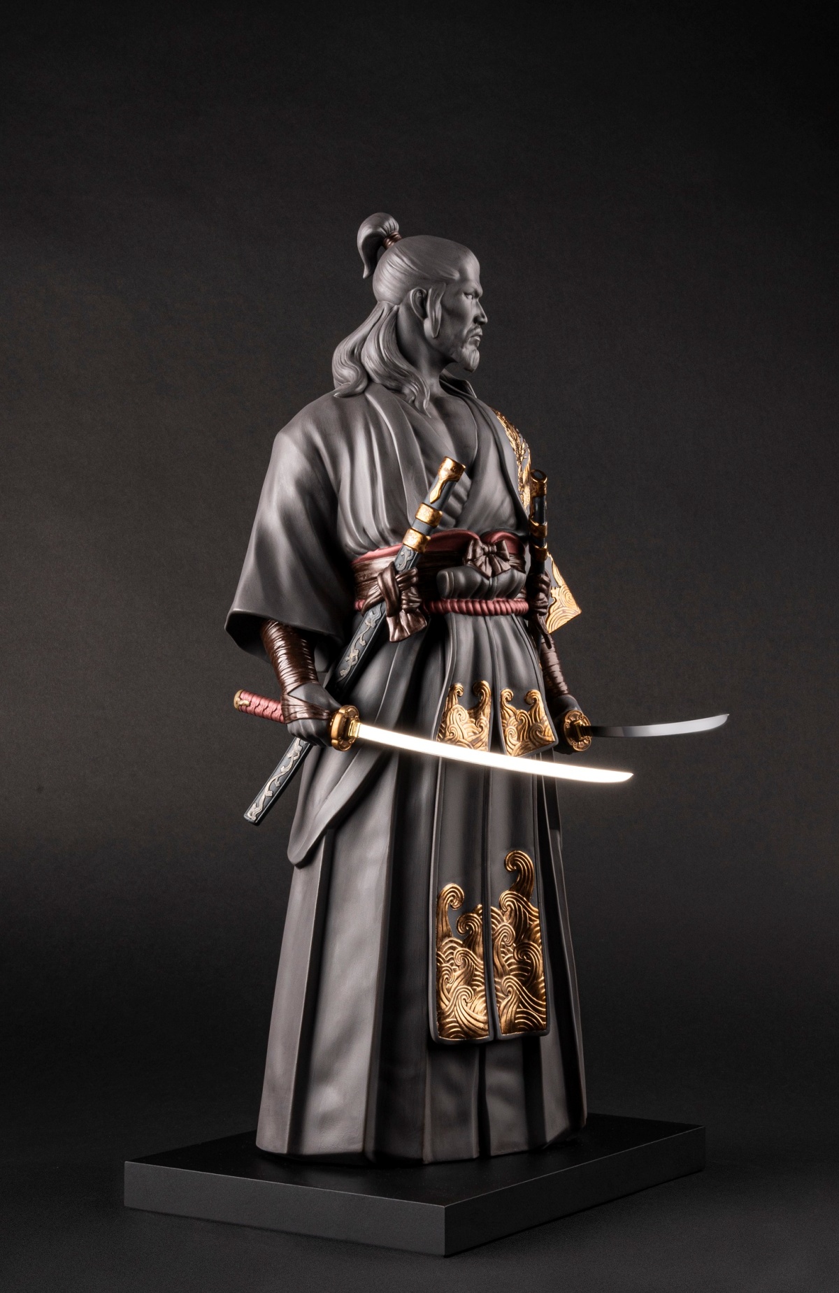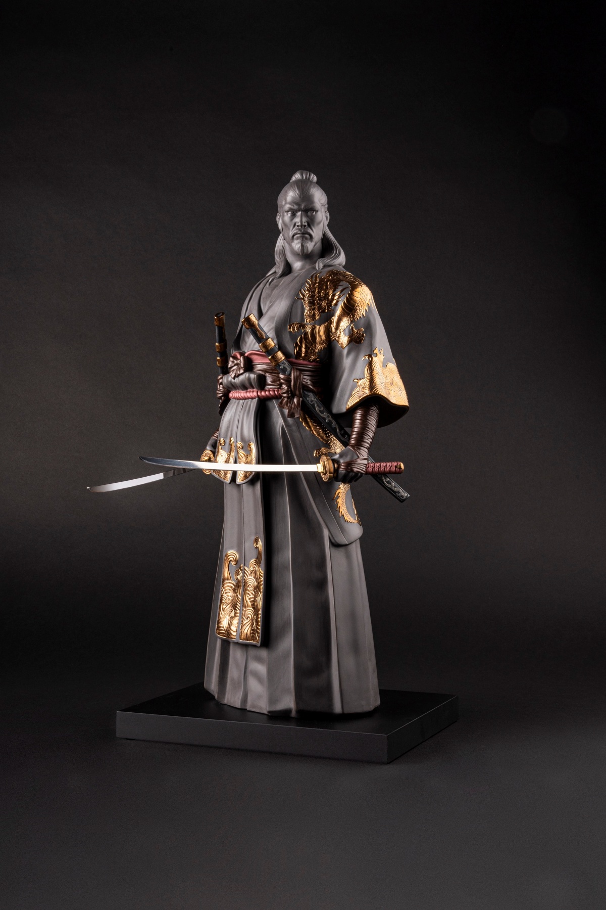 作品以霧面黑瓷為主調,搭配金屬光澤細節,從衣袍紋理、龍紋裝飾到雙刀配置,皆由工匠手工雕刻完成。沉穩的造型彷彿凝結於出鞘前一刻,蘊含強烈張力與內在力量,呈現兼具歷史厚度與當代雕塑語彙的藝術作品。