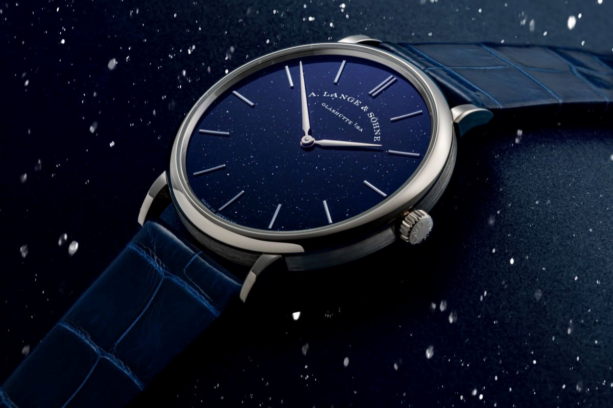 而 SAXONIA THIN 以手工拋光的金製錶盤覆以多層透明塗層,內含細緻的銅藍色微粒,