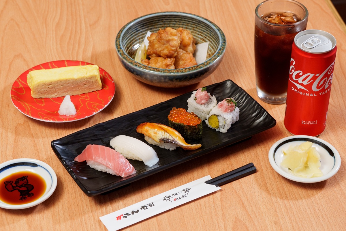 套餐內容包含五貫經典壽司(黑鮪魚中腹、槍烏賊、鰻魚、鮭魚卵軍艦、鮪魚泥花卷),同時還搭配了能讓饕客感受店內現點現做小品功力的「唐揚雞」與「玉子燒」。在飲品選擇上,合點壽司提供了 Highball、味噌湯或可樂三擇一 。川村料理長強烈建議以 Highball 完成整體食序 。