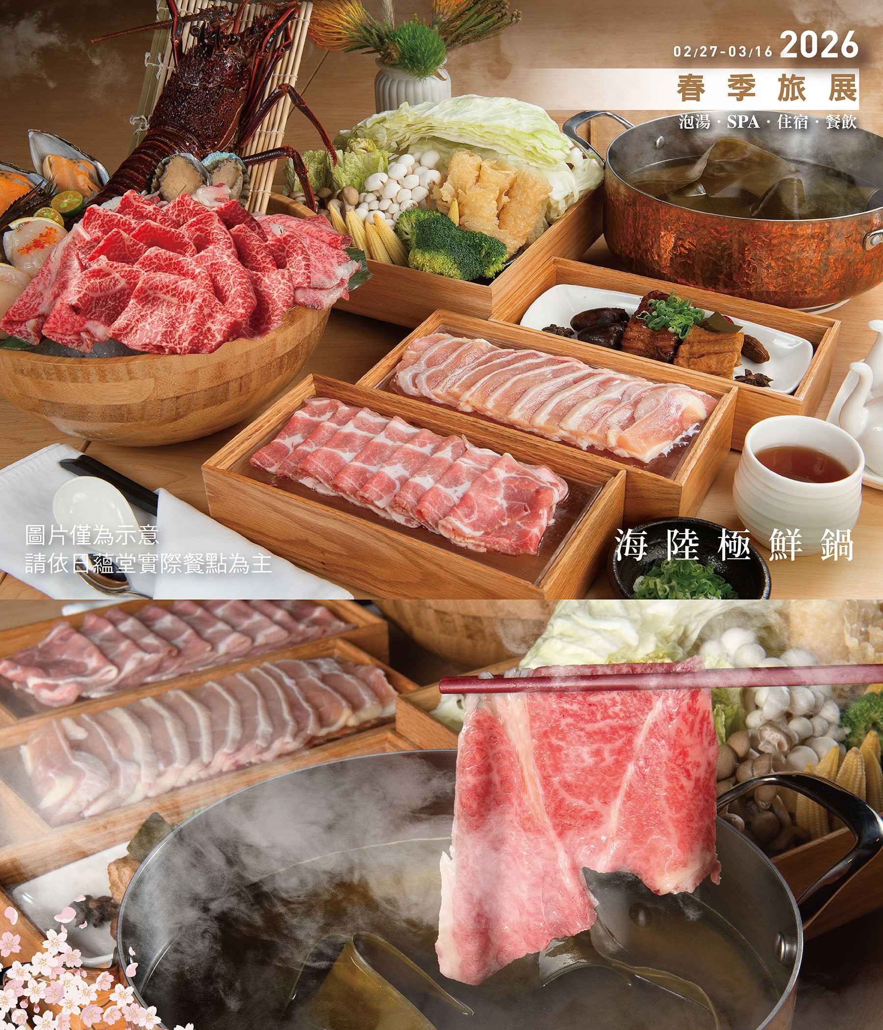 旅展中最受消費者喜愛的「一泊一食」、「一泊二食」住宿券,在本次2026春季旅展中也設計推出「23坪雙人土舍套房買三送1」超值組合,包括平日入住享限量升等30坪水舍套房及加人不加價優惠,其中在「一泊一食」部分還加贈價值NT$1,680雙人茶蘊席下午茶,讓你在一邊渡假、一邊拍下網美照紀錄旅行回憶。而懶人旅行最愛的「一泊二食」住宿券,則以滿滿的新鮮食材入菜,將當季時令的豐收與鮮美,化為滿滿一鍋的「雙人蘊式海陸極鮮鍋」,在氤氳熱氣中細細品嚐主廚的匠心蘊暖。