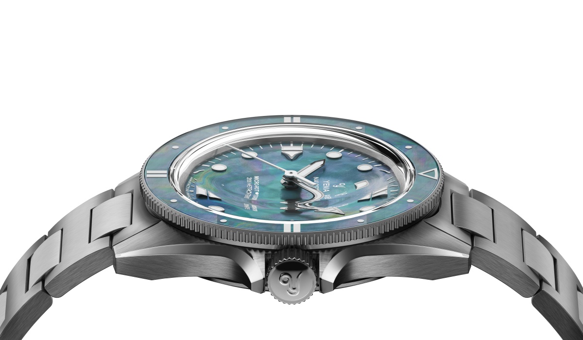 珍珠母貝錶圈與錶盤的精緻美學相呼應,其渾然一體的天然紋理更襯托出腕錶的璀璨光芒。為保護其嬌嫩之美的錶圈覆以樹脂塗層,並覆以耐雙拱形藍寶石水晶玻璃錶鏡令腕錶從各個角度都擁有深邃清晰的視覺效果。兩者完美融合,兼具精緻美感與卓越耐用性。