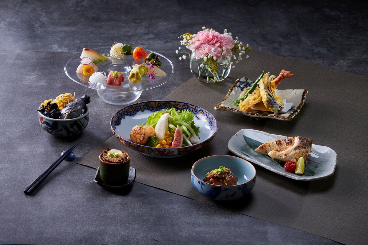 「中山日本料理廳」則以細膩日式會席詮釋季節旬味,推出「香煎干貝佐綠竹筍沙拉」、「刺身盛合」、「松露鮑魚玉子蒸」、「明蝦天婦羅」、「青甘下巴塩烤」、「日本和牛燒肉飯」及「黑蒜烏骨雞湯」等多道料理,展現食材原味與職人手藝,營造優雅且富層次的用餐體驗,每套2280+10%元。
