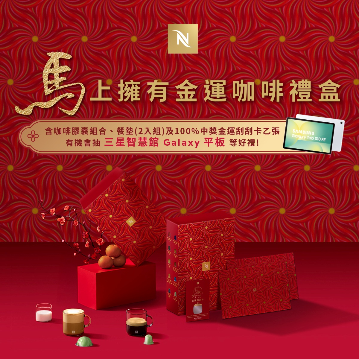迎接金馬新春,Nespresso 於 1 月 22 日推出「福滿花開金運咖啡禮盒」(Original 系列建議售價 2,580 元;Vertuo 系列建議售價 2,380 元),含咖啡膠囊組合、福滿花開迎春餐墊2入組及100%中獎率金運刮刮卡1張,為年節送禮、走春拜訪與居家聚會,打造更具儀式感的選擇。