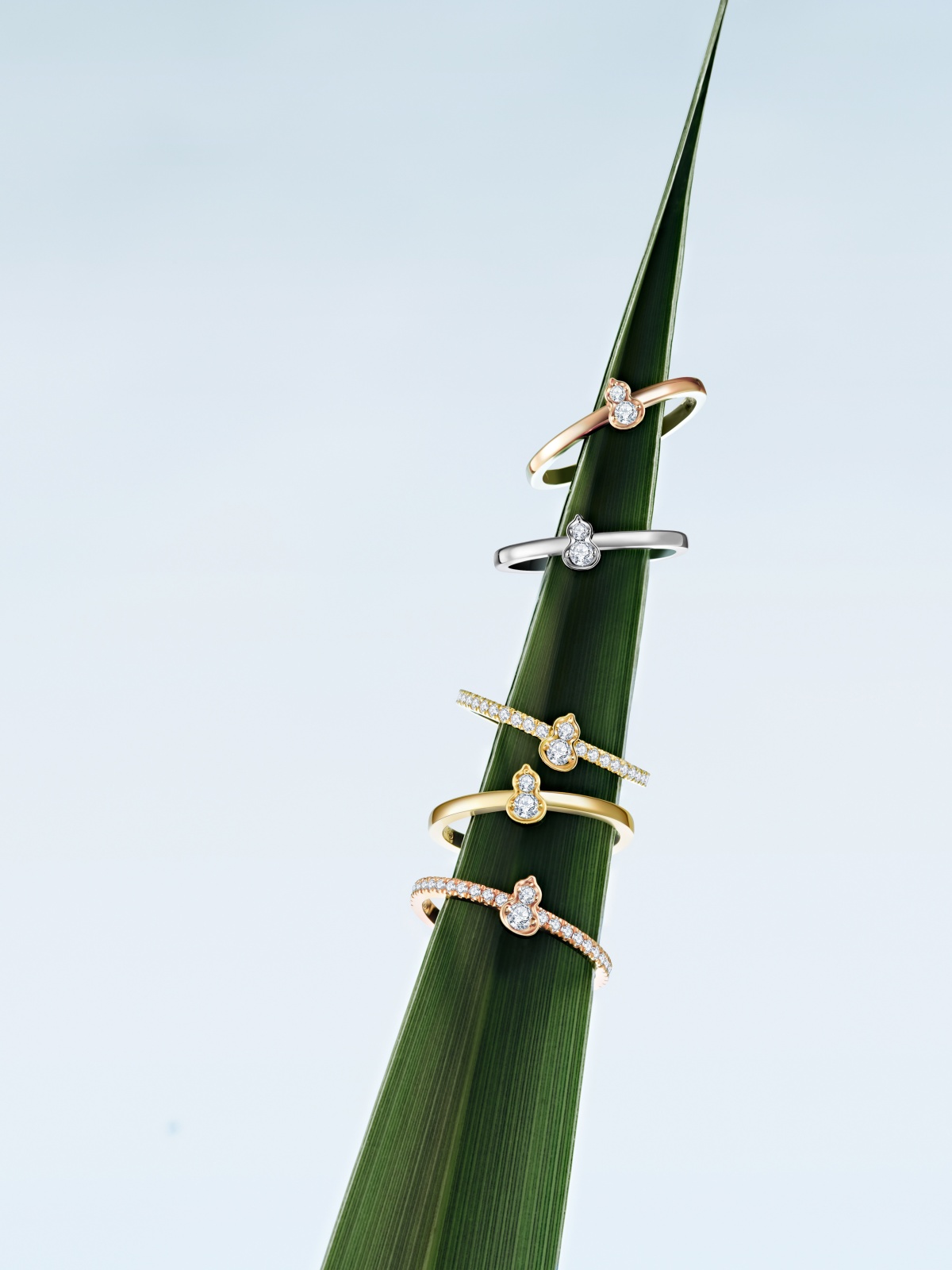 Qeelin「Wulu Mini Solitaire」系列項鍊與耳環以 18K 玫瑰金或白金打造,輕盈點綴頸間與耳畔;戒指可選素雅光面或密鑲鑽石,搭配 18K 白金、黃金或玫瑰金,賦予女性自由疊搭的創意空間。