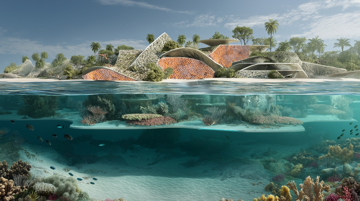 珊瑚牆:源自阿聯酋沿海建築使用珊瑚石的歷史,重新想像為一種具生命力的建築形態,承載記憶、韌性與再生,連結海洋與陸地。