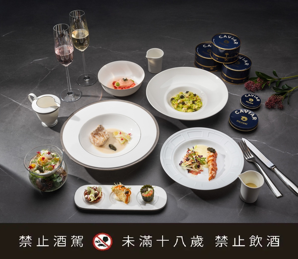 餐點:五道式套餐,包含「酒窖迎賓」三款魚子醬品鑑、開胃小點及五款精選羅蘭香檳