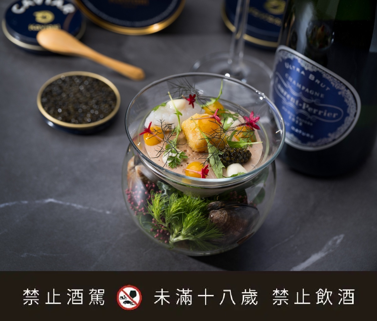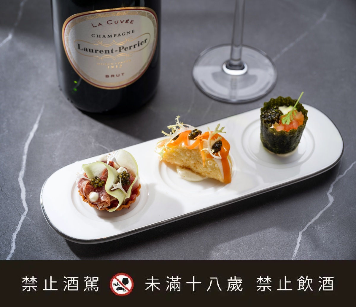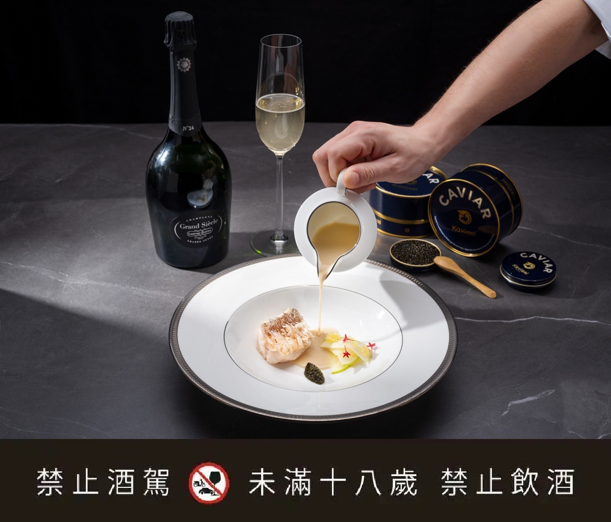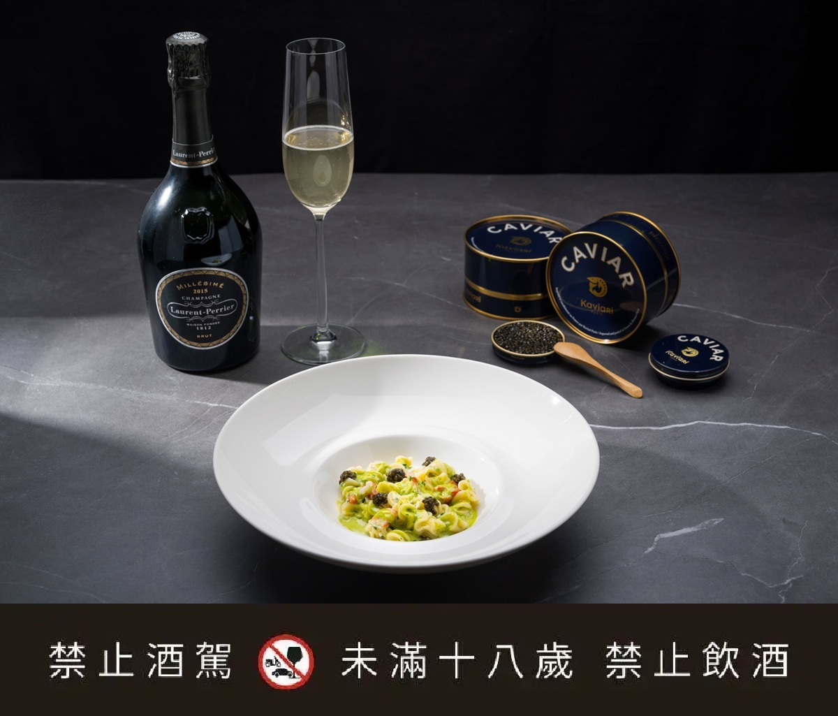 整場盛宴佐以五款精選羅蘭香檳,從清新雅緻的 La Cuvée Brut 到珍貴的 Grand Siècle No 24,香檳的細緻氣泡與酸度,完美勾勒出魚子醬的鹹鮮韻致與料理中的香草、脂香,演繹一場跨越義法疆界的極致饗宴。