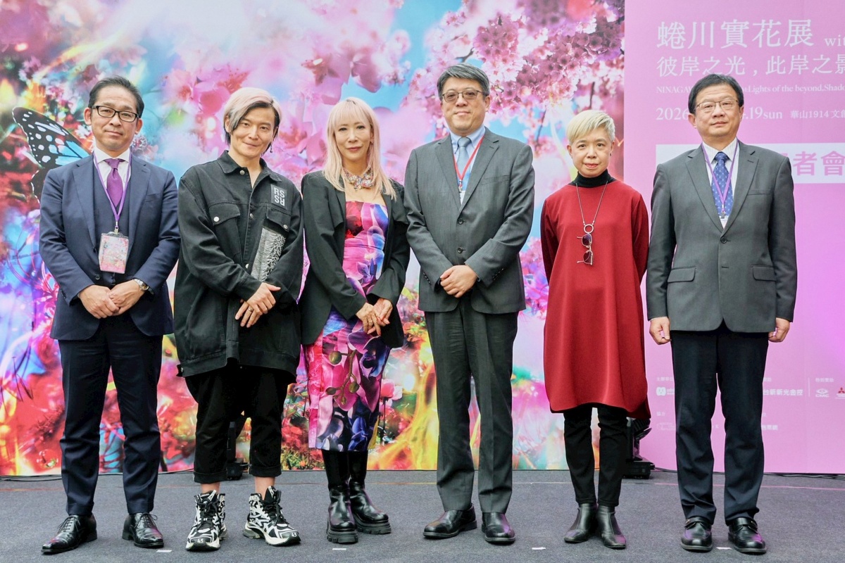 當代藝術家蜷川實花親自來台參與佈展並出席《蜷川實花展 with EiM:彼岸之光,此岸之影》開幕記者會(由左至右:特別協贊株式會社BUFFALO常務執行董事横井一紀、數據科學家/EiM製作人宮田裕章、當代藝術家蜷川實花、主辦單位聯合數位文創董事長李彥甫、主要贊助台新新光金控代表台新銀行文化藝術基金會執行長鄭雅麗、特別贊助中華汽車工業股份有限公司副總經理廖景雲)