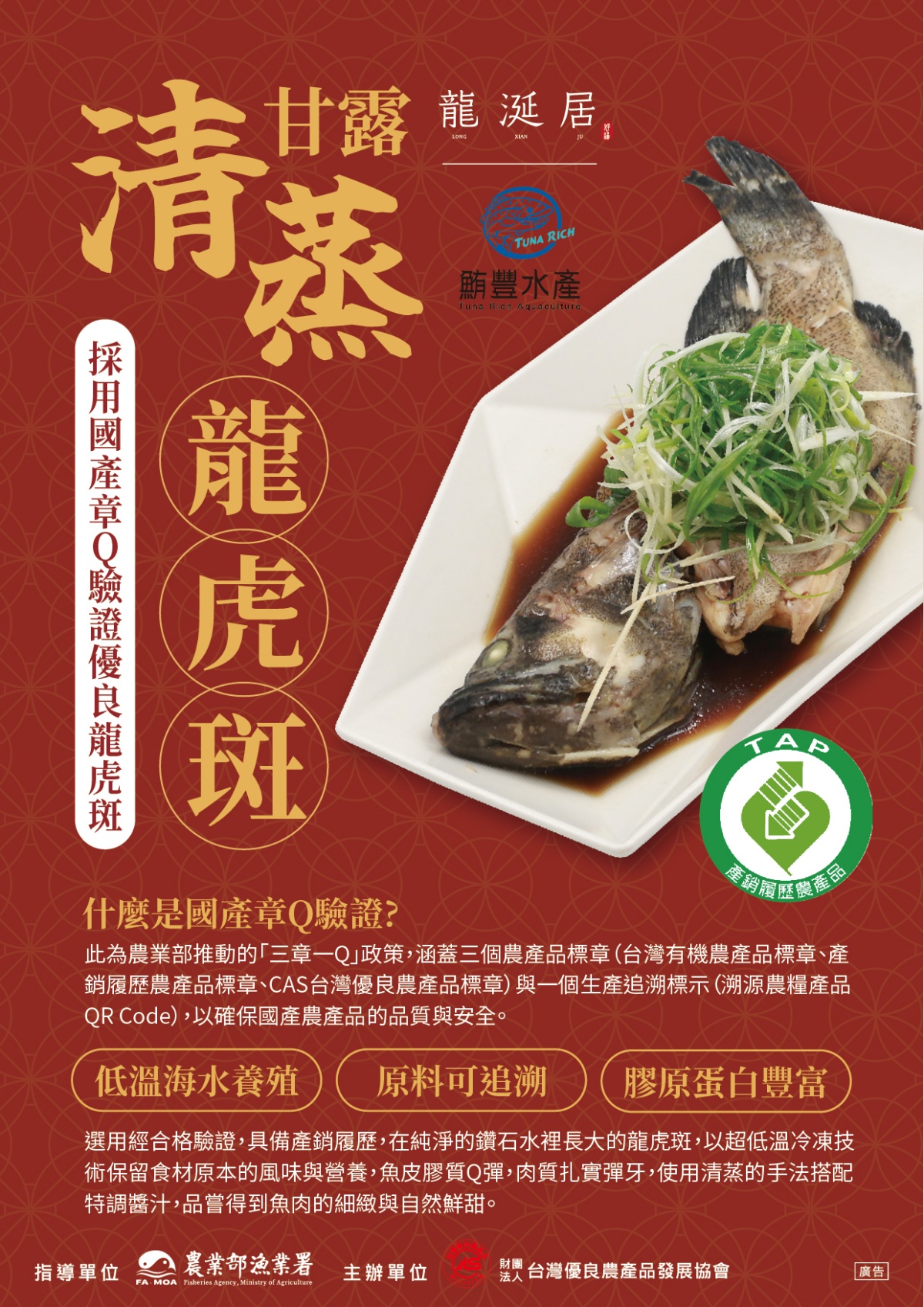 龍涎居將以「甘露清蒸龍虎斑」這道精心烹調的年菜,來呈現具備產銷履歷驗證之國產章Q優良龍虎斑的卓越風味。透過傳統清蒸手法,搭配特製甘露醬汁,將龍虎斑細緻彈牙的肉質與豐富膠質完美襯托,每一口都充滿海洋的鮮甜與年節的喜氣。這道料理不僅突顯龍虎斑的天然風味,更展現了龍涎居在食材選擇與料理上的深厚功力,為團圓飯增添一道兼具美味與健康的亮點。