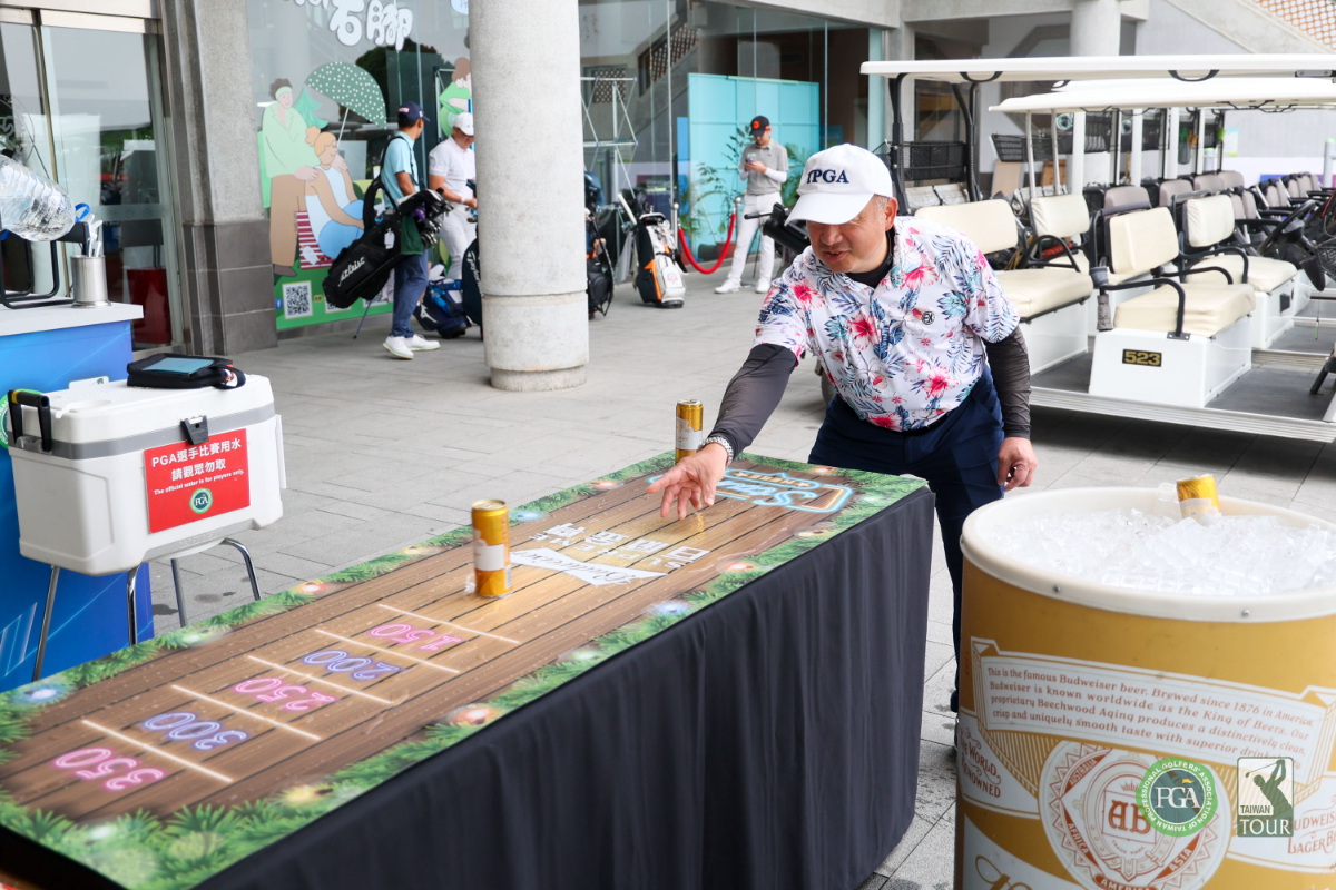 另外,大會今天為了增加配對賽的趣味性,在球場出發櫃台附近設置了一處趣味遊戲台─百威挑戰賽,挑戰者將百威啤酒的鋁罐在平台上向前推,最靠近桌面前緣且不掉落者為勝,勝者可贏得12瓶百威金尊330ml。今天約有60位選手進行這項挑戰遊戲,最後由大崗山球場董事長卓建宏獲勝,得到獎品。