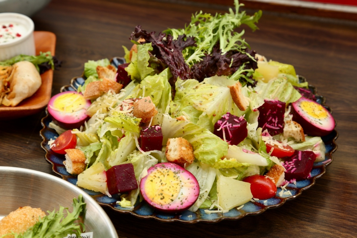 在賓夕凡尼亞州的日常飲食中,甜菜醃蛋原本是一種透過醃漬方式來延長食材保存時間的做法。將煮熟的雞蛋浸泡在醋與甜菜汁中,不只是為了風味或顏色,而是源自過去沒有冷藏設備時的生活經驗。那層紅紫色,是料理在時間中留下來的痕跡。ABV 將這樣的做法轉化為 甜菜醃蛋沙拉(Amish Beet Pickled Egg Salad),以沙拉形式呈現,保留酸甜風味與鮮明色澤,讓這道原本常見於家庭聚會的小食,自然融入餐桌。