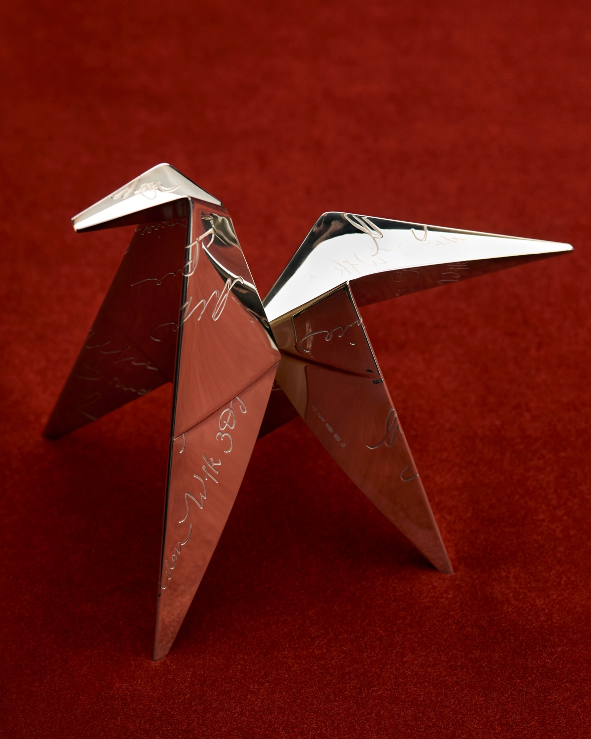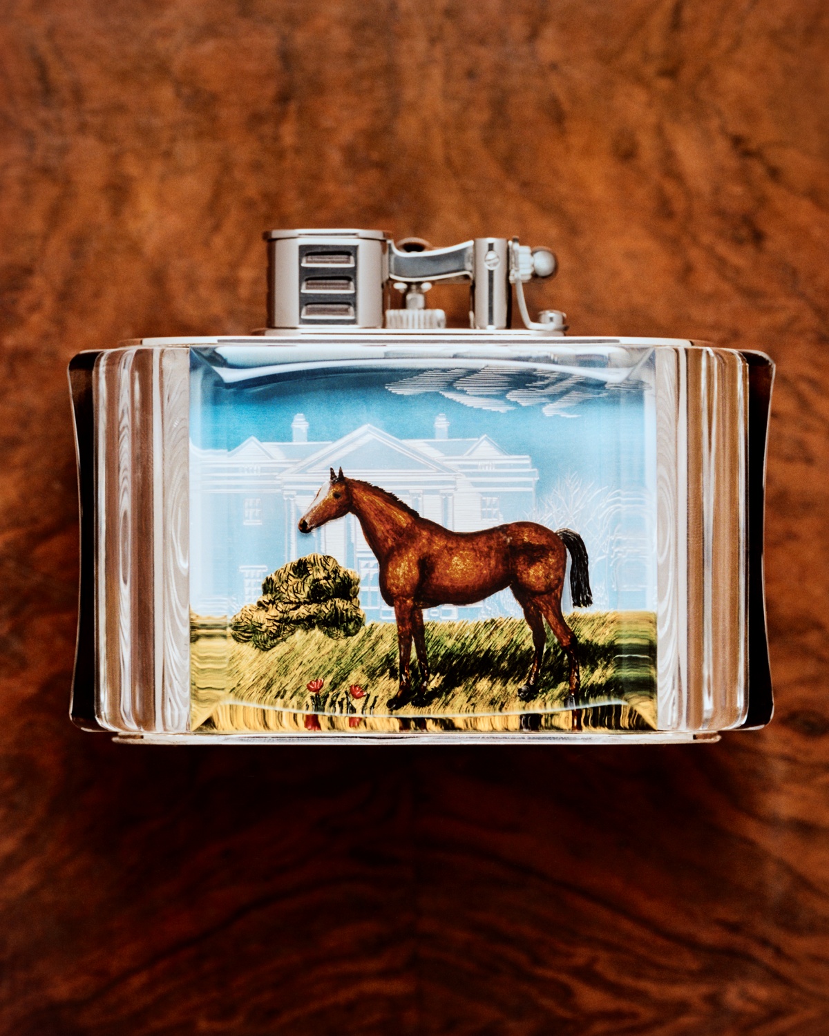 系列另含一款鍍金黃銅馬首雕塑Rollagas打火機,設計靈感可追溯至品牌2030年代製作的動物造型器物。其立體馬首輪廓、鐫刻馬鬃紋理與寶石鑲嵌的點睛一筆,是以金屬工藝鑄重工的驚艷之作。全球限量發行的8枚純銀版打火機,更顯稀世華彩:紅寶石雙眸、梨形托帕石與通身細膩的手工雕紋等細節,承載獨特質感。