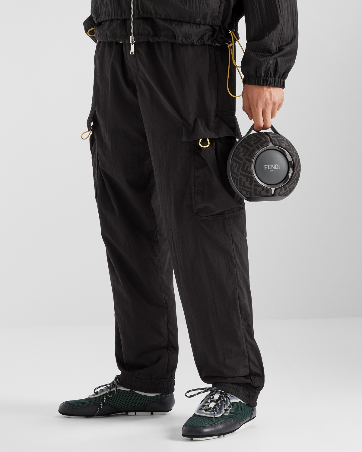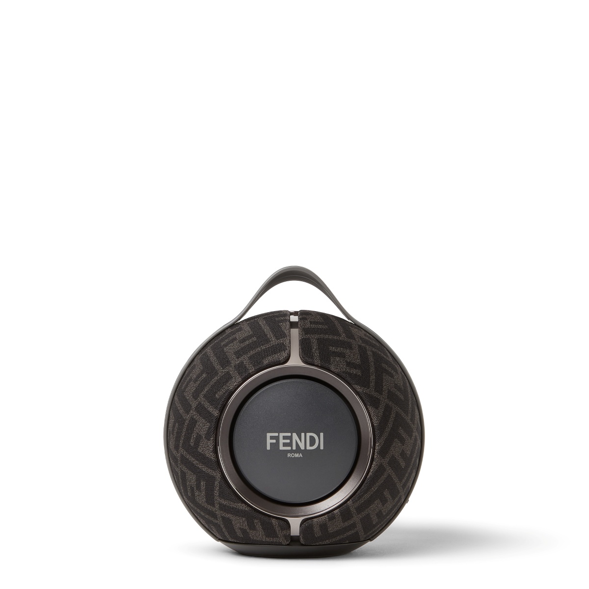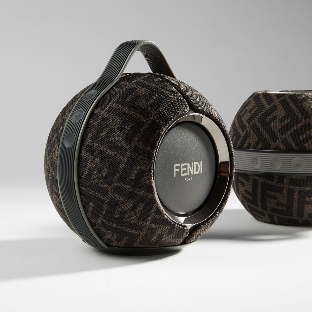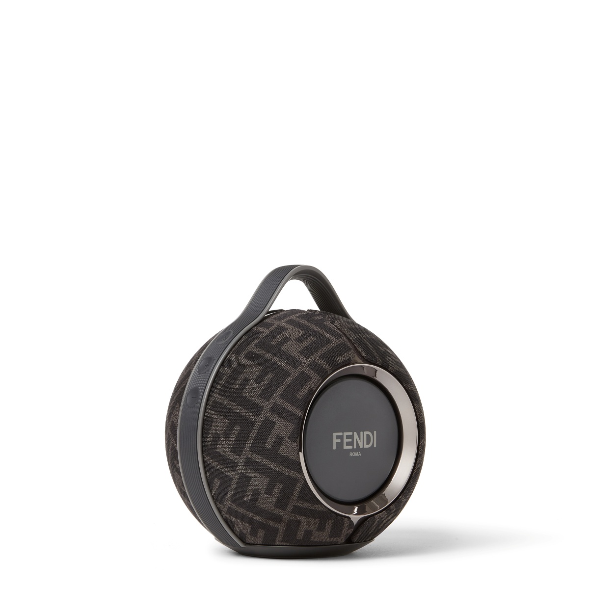 標誌性的雙色 FF 圖案優雅地環繞在音響的織物錶面,搭配深灰色提手和帶有鍍鉻裝飾的黑色金屬環,盡顯精緻格調。低音單元中央飾有醒目的 FENDI 標識,成為這件非凡設計作品的點睛之筆,彰顯其獨特而大膽的個性。