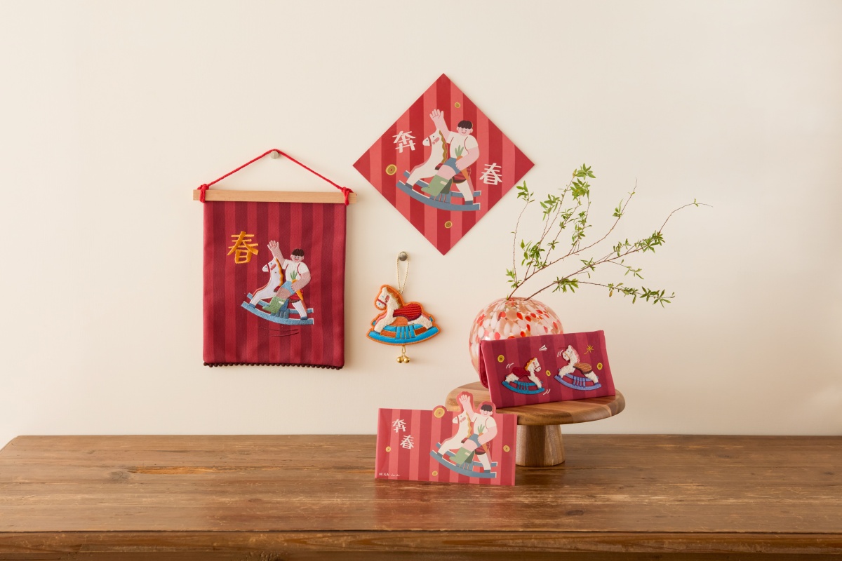 在年節佈置上,HOLA 觀察到消費者逐漸跳脫制式春聯與佈置,轉而尋找更具情感記憶與諧音趣味的吉祥話。因此,新年特別攜手插畫藝術家朱緹,以「童玩」為靈感,將記憶中的台味小豬撲滿、搖搖木馬、蝴蝶炮、劍玉與仙女棒等經典元素,轉化為斗方、紙紅包、刺繡布紅包、抱枕、吊飾等節日布置,讓年節祝福自然融入居家空間。