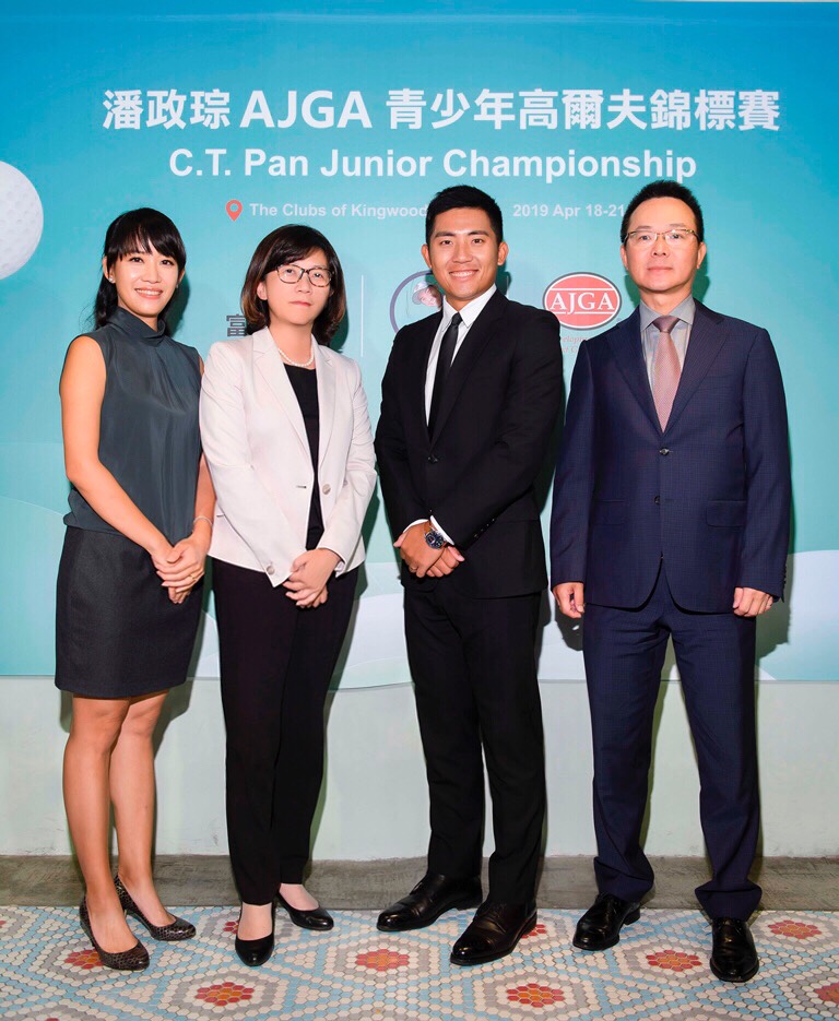 小潘以個人名義冠名主辦「潘政琮AJGA青少年高爾夫錦標賽」,創造台灣選手赴美參賽、受到NCAA教練關注的管道。圖為2018年10月的記者會上,他和老婆Michelle、中華高協理事長王政松(右一)與富邦金控資深副總陳昭如(左二)合影。