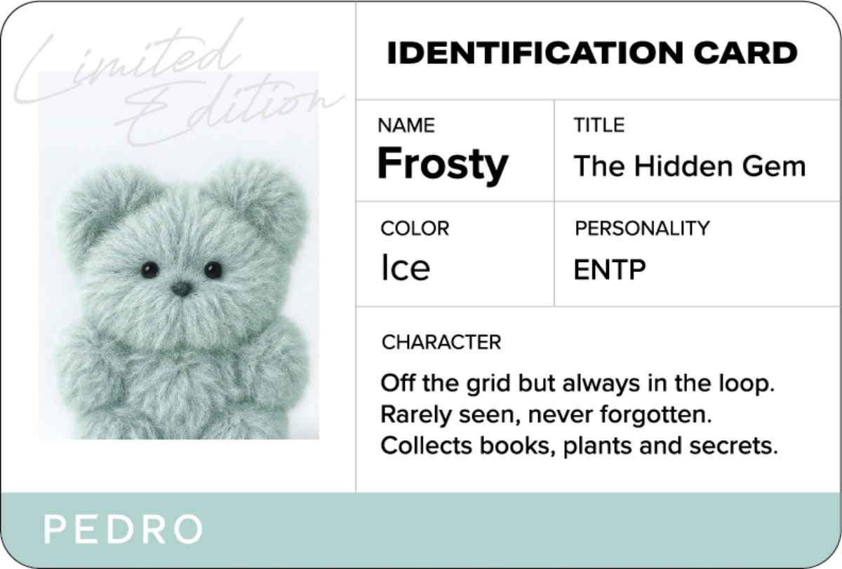 擁有純粹的極地藍質感,卻散發鮮明個性。Frosty 不只是低調,而是懂得在對的時刻閃耀,以靈感和幽默點亮每個場景。身為 ENTP,Frosty 以敏捷思維和創意火花擁抱未知,總能在對話中拋出驚喜,讓氛圍瞬間升溫。書籍、植物與音樂是他的靈感燃料,將日常化為一場腦力激盪的遊戲,演繹專屬的摩登風格。
