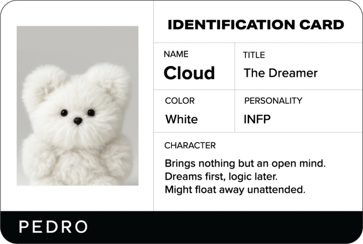 雲朵的純白,不只是顏色,而是一種態度。Cloud盛載著無窮夢想,以開闊的心境擁抱世界,總是先讓想像奔跑,再用邏輯鋪陳現實。每一次出場總能帶來驚喜,作為 INFP,Cloud 以細膩情感編織靈感,將理想轉化為日常的美學篇章。