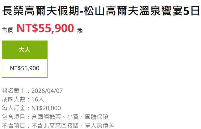長榮高爾夫假期 松山高爾夫溫泉饗宴5日 2026/04/07-2026/04/11