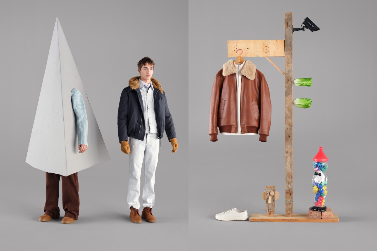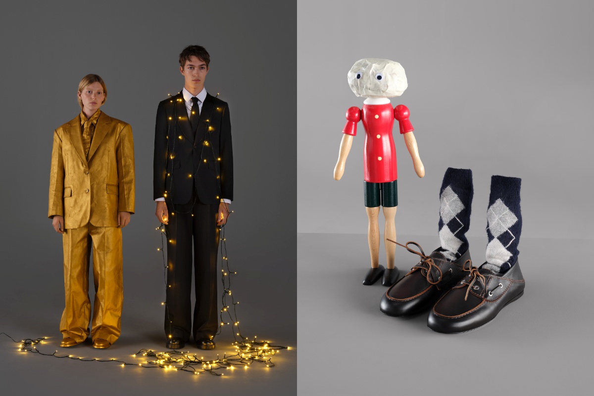 男裝系列以節日幻想為題,融合法式俏皮與現代簡約。淺藍針織毛衣、粉色襯衫、棕色外套與皮革飛行夾克,展現冬日溫暖質感。丹寧套裝以寬鬆剪裁與反摺細節呈現俐落層次;深灰與經典黑色西裝則散發節慶儀式感。整體造型在率性與優雅間遊走,捕捉節日時分的輕盈氣息與獨立態度,展現冬夜中的法式魅力。