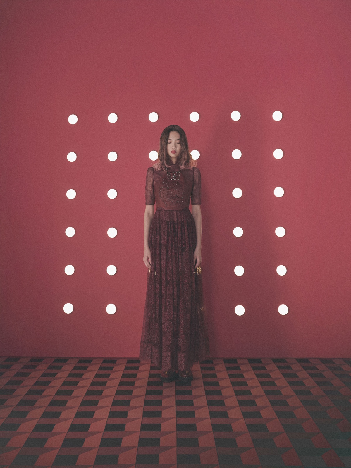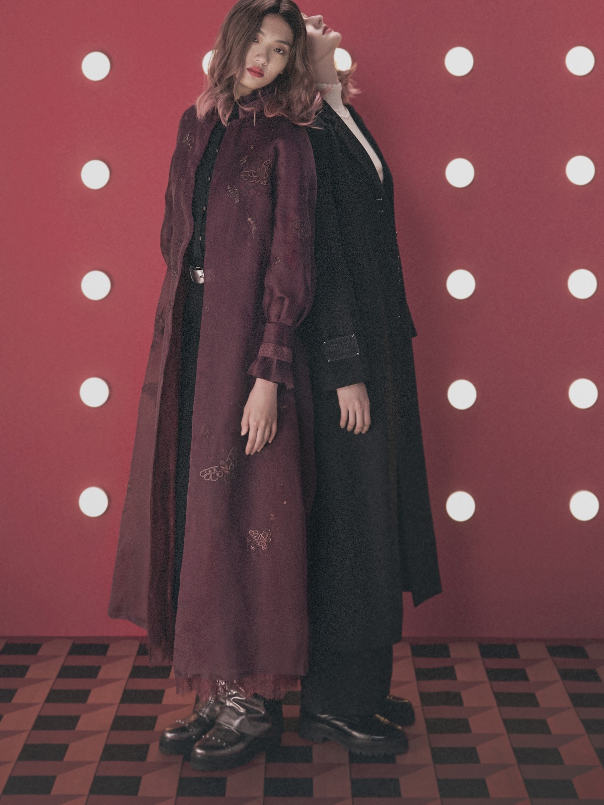 如全亮片立領外套,以苗族服飾的結構線條為靈感,並以鉚釘鑲邊織帶強化節奏;孔雀綠絲緞刺繡長大衣、絲緞面中式洋裝與全蕾絲酒紅禮服,在光與影的掠動間綻放剛柔並濟的韻律,層層折射出冬日的深邃與溫度。