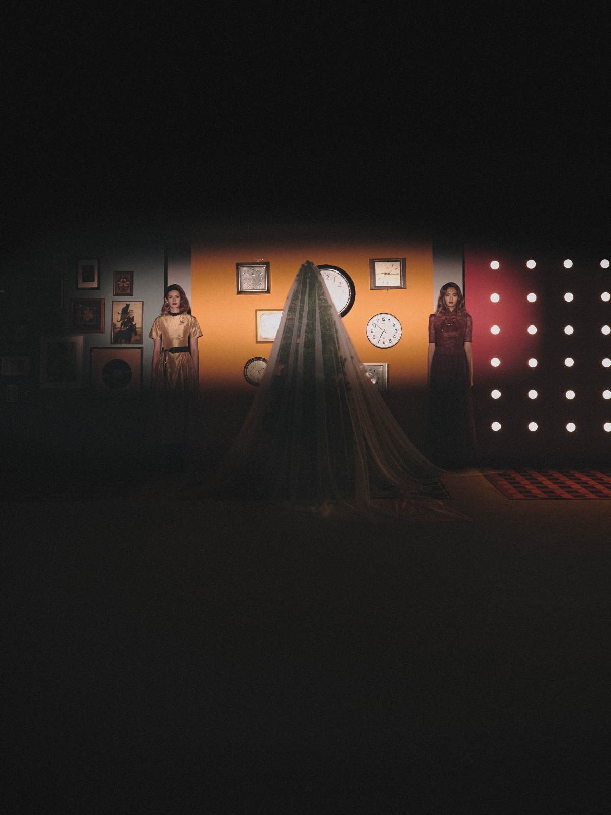 服裝造型以布面的厚薄與光影反差構築「彼此照映」的對話。一方以繁複層疊與手工細節書寫時間的篇章;幽靈支線則以輕紗延伸記憶的氣息。兩者一繁一簡、一明一幽,在紅牆光影間交融。