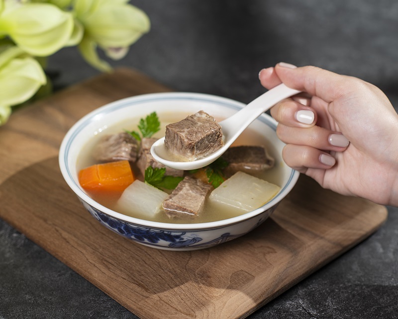 除了現場多樣的各式和牛料理,主廚特別於假日加碼推出主廚敲鑼料理「越南式清燉和牛牛肉湯」,師傅將紅蘿蔔、白蘿蔔和洋蔥等蔬菜滾刀切塊,加入牛大骨熬煮出食材鮮甜,越式清澈透明的湯底凸顯出牛肉的鮮美,肉質軟嫩沒有粗糙的纖維,再擠上一點新鮮檸檬汁,賦予湯頭微酸口感,更加爽口鮮美。