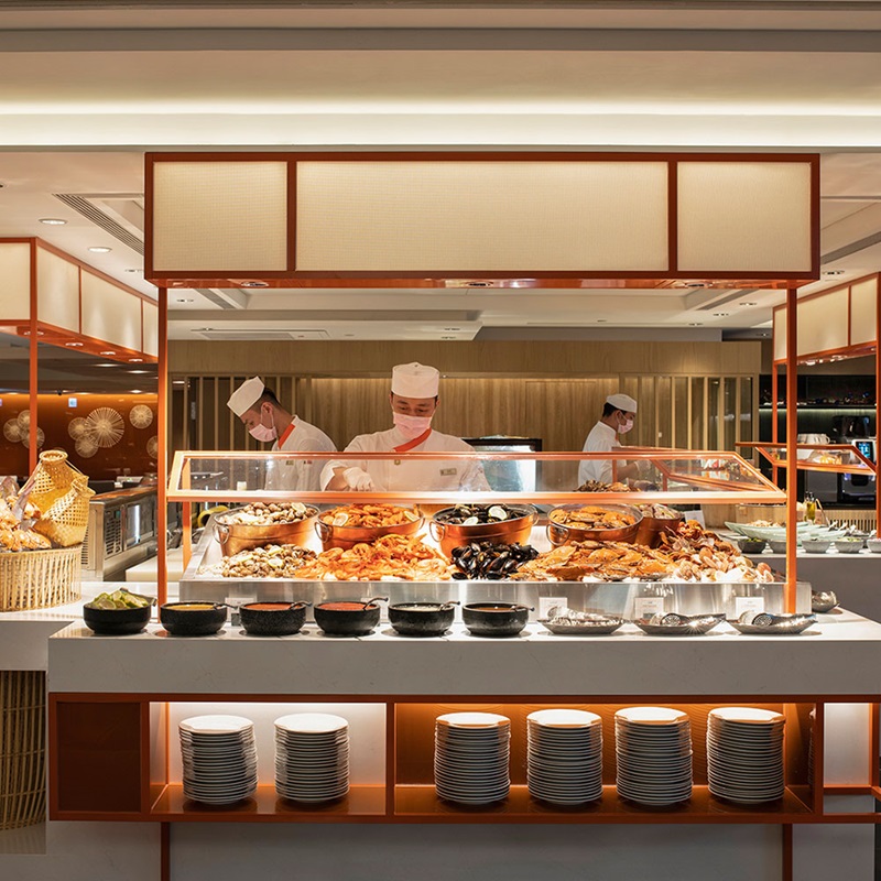 一走進遠東Café,最吸睛的就是炭烤餐檯這塊大肉。主廚嚴選澳洲和牛胸靠腹部的軟嫩部位,將重達5公斤的牛肉以145到165度低溫慢烤2-3小時,簡單灑上鹽和胡椒調味,接著靜置50度的恆溫箱中一小時,慢慢熟成後由外而內鎖住肉汁,再將法式芥末醬抹至其上,逆紋切開,立見淡粉色細嫩鮮美的肉質,絕對是愛肉族來到自助餐必吃的極品美味!