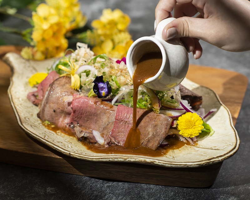 開啟吃到飽的「包肥」旅程,當然要先來點清爽開胃菜,主廚使用柴魚高湯及特製橙醋汁熬製醬汁,先將整片和牛炙燒上色,並鋪在紅洋蔥絲、生菜絲上,最後淋上熬好的醬汁、醋以及少許柴魚片為和牛增添鮮美香味,是一道經典的日式開胃料理。