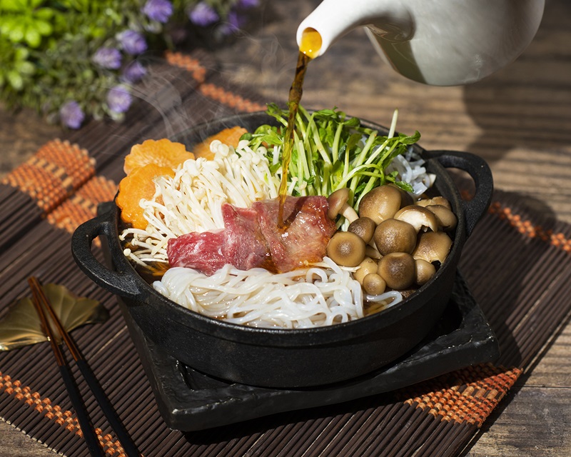和牛壽喜燒以日式高湯、醬油、洋蔥、奶油炒香過的壽喜燒鍋底,選用優質的和牛將其切成薄片,頗面呈現出完美的大理石油花,現點現涮和牛薄片,再搭配新鮮蔬菜,佐上香甜的日式壽喜燒醬汁,令人愉悅的甘醇鮮甜,非常適合在冬日裡來上一碗溫暖身心。