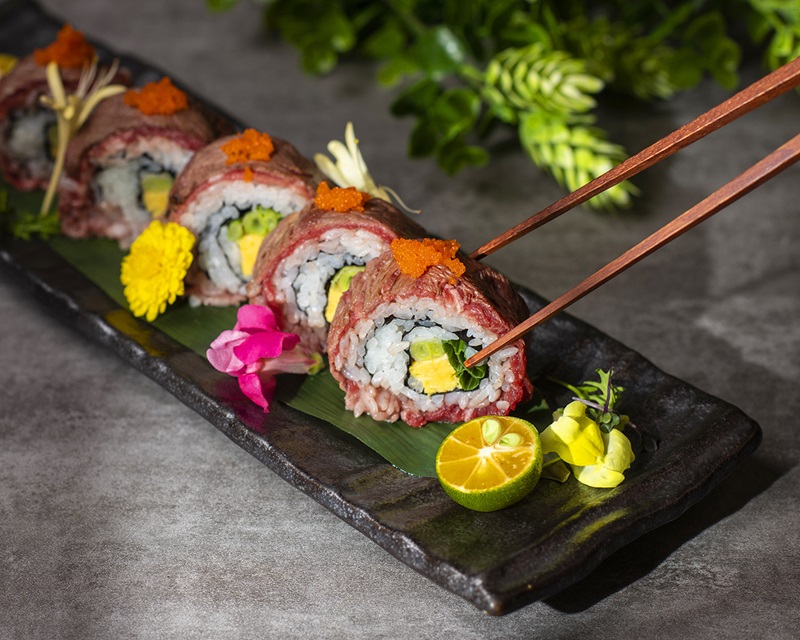 日式料理餐檯不僅有平時深受食客喜愛的炙燒和牛握壽司,活動期間還加碼供應炙燒澳洲和牛加州捲,以飽滿Q彈的壽司米包裹著玉子燒、蔥蒜和海苔,將和牛片包裹於壽司外層,師傅將表面微微炙燒上色,最後將晶瑩剔透的蝦卵點綴其上,幸福滿足的滋味讓人淚「牛」滿面。