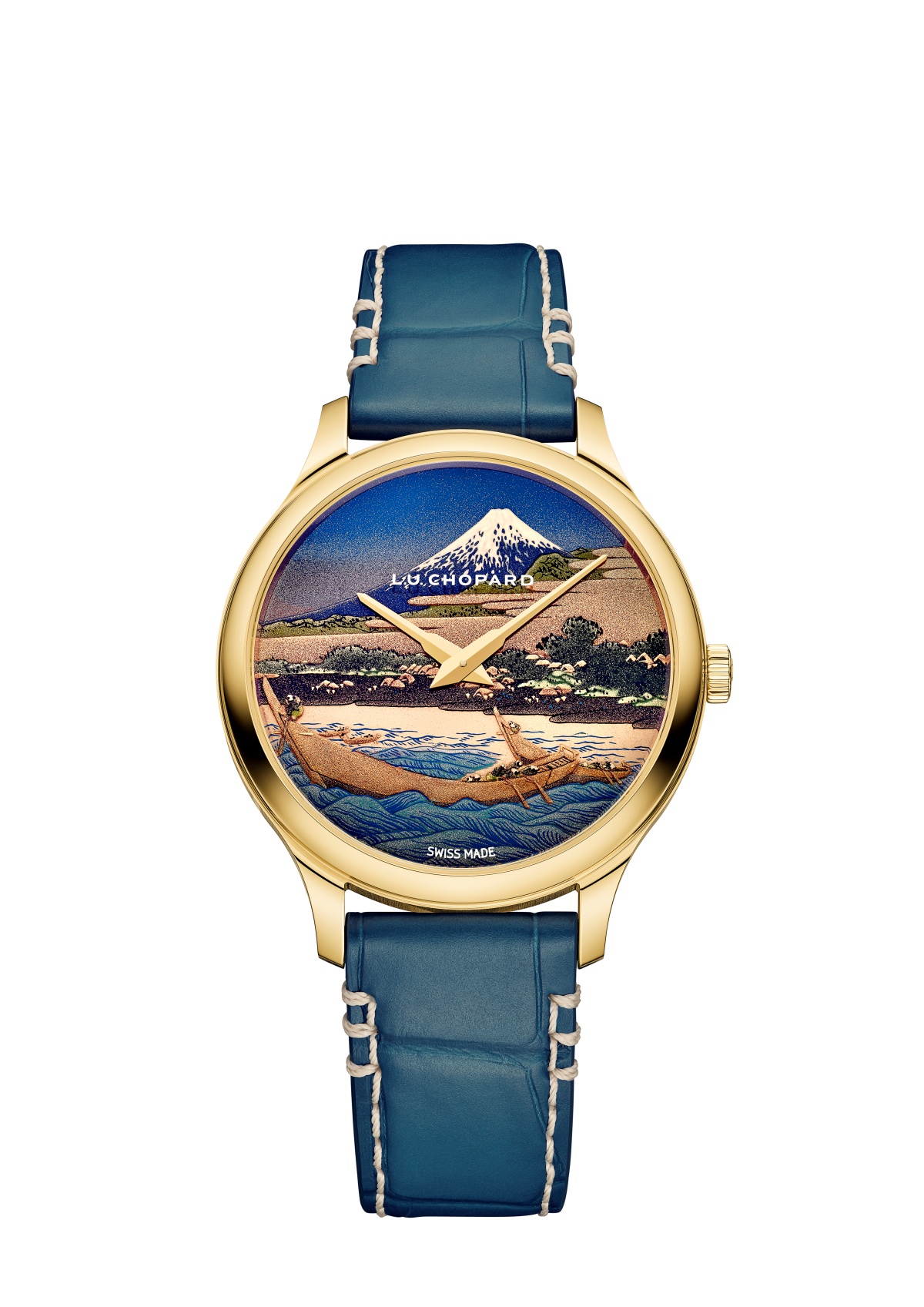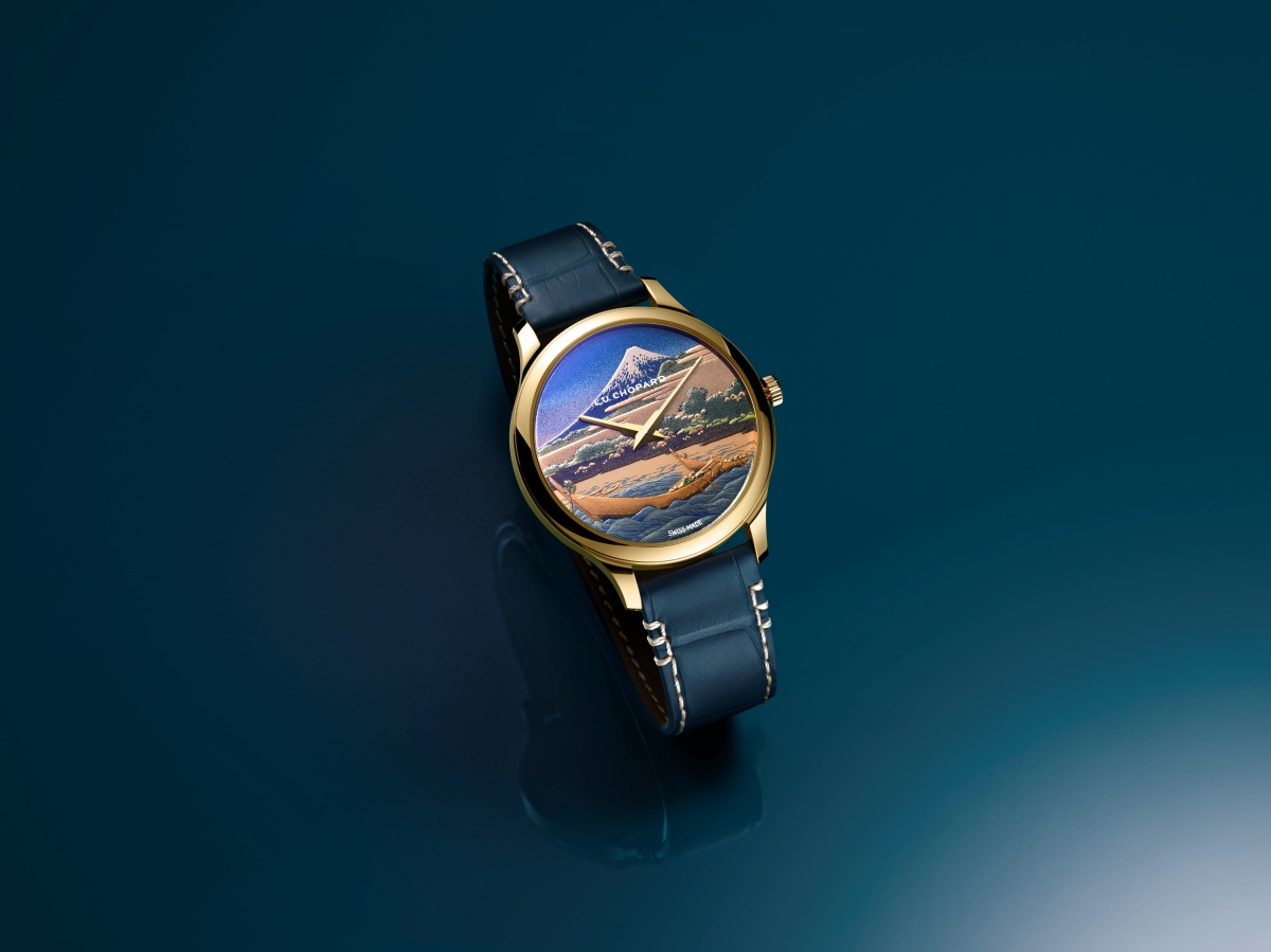 這款描繪富士山景緻的非凡創作全球僅限量發行8枚,旨在向日本浮世繪大師葛飾北齋的傳世名作致敬。其獨一無二的錶盤由漆藝大師以傳統蒔繪技術手工巧製而成。以符合倫理道德標準18K黃金錶殼打造的錶殼纖薄優雅,搭載L.U.C 96.41-L機芯,配備22K金微型擺陀,動力儲備長達65小時。此創作完美彰顯品牌尊崇傳統、頌揚匠藝、追求極致的製錶哲學。