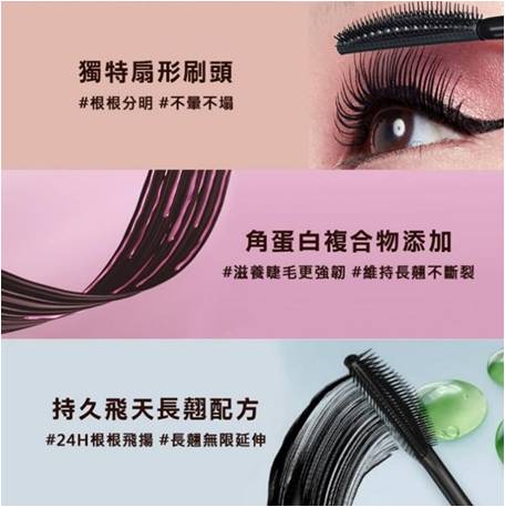 創造炸飛感睫毛的關鍵,來自「飛天翹防水睫毛膏」的特別成分及刷頭。採用獨家24H飛天瞬翹科技,膏體輕盈持久長翹,長時間防水不暈妝,搭配輕盈且持久飛天長翹膏體,一刷立即纖長飛翹,使用後睫毛瞬間無限延伸。其中更全新添加角蛋白複合物,擦睫毛的同時讓睫毛更強韌捲翹,維持長時間持久根根飛揚!