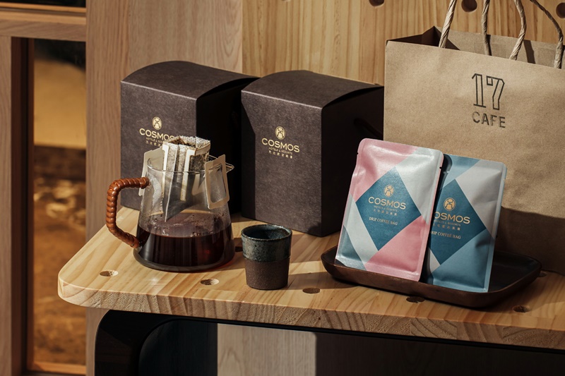 同時,主訴外帶TOGO帶著走的消費者,天成17CAFE外帶店呼應環保議題,特別挑選台製廠商出品的外帶杯,無須再多一層額外使用隔熱杯套,外層獨特的絨毛設計可耐熱120度有較佳的隔熱功能,而容器外層的發泡可達93%自然分解,材質較安全也達減塑的目的,杯身設計以幾何圖形呈現大塊的多邊形,使用靛藍色、白色、灰色作為重點色系,同步也推出天成17CAFE保溫杯,沉穩的視覺風格襯托出簡約與純粹,誠如單純想把一杯咖啡煮好的精神。