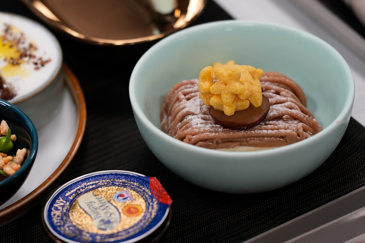 主菜亮點「剝皮辣椒雞肉丸」結合卡拉瑪塔橄欖,辛香與甘甜交錯;「鮑魚剝皮辣椒雞小米粥」更將細膩粥底搭配 XO 醬、滷鮑魚肝,堆疊出口感衝擊。甜點「栗子蒙布朗」則以當季栗子溫潤收尾,為高空餐桌添上秋日暖意。
