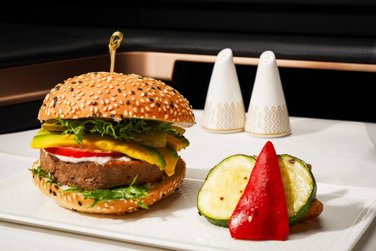 主菜「麻香猴頭菇彩蔬鈺膳」以花蓮芋香米襯托猴頭菇層次,長程航線還推出創新的「菲力猴菇排漢堡」,外酥內嫩,別具驚喜。星宇更讓部分非素食餐也能選擇鈺善閣特製蔬食,將養生與永續理念拓展到更廣的旅客群體。