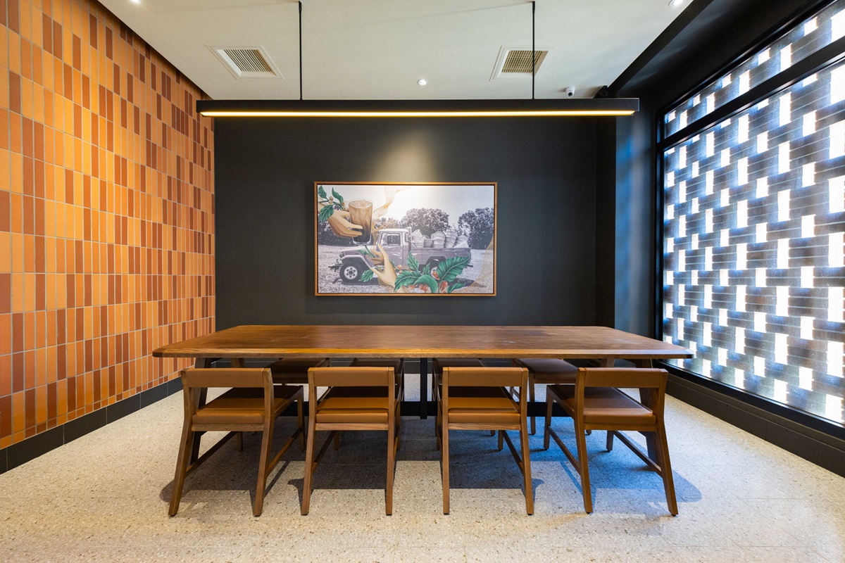 門市內則來自外部磚塊材料的啟發,將外部紅磚造型延伸至室內大片牆面,並以磚塊排列手法產生立體動態感,整體呈現如古早紅磚的暖色調,吧檯上方則運用木飾條長短排列產生的隱形波紋增添精緻的現代感。