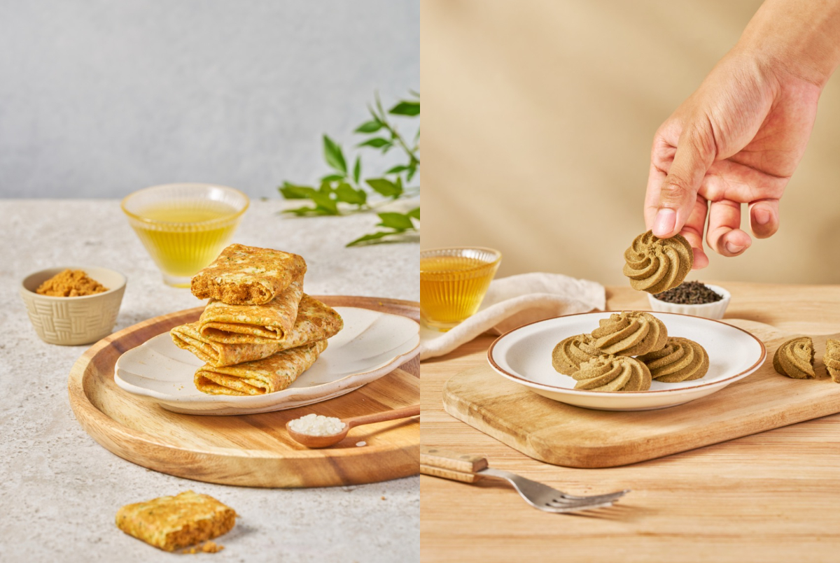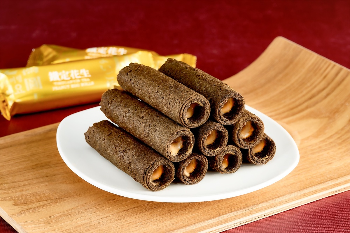 「花香流心酥」以貓空包種茶為靈魂,翠綠餅皮搭配茶巧克力玫瑰圖騰,一口咬下,茶香流心迸發,如同秋夜花園般浪漫。最後,「鐵定花生」鐵觀音花生蛋捲,以彰化 9 號花生研磨內餡,搭配茶香蛋捲皮,鹹香酥脆,盒面還設計可旋轉祝福小卡,增添趣味與心意。整體黃金色系的包裝高貴討喜,既能體現茶點文化的雅緻,又讓祝福以最時尚的方式傳遞。