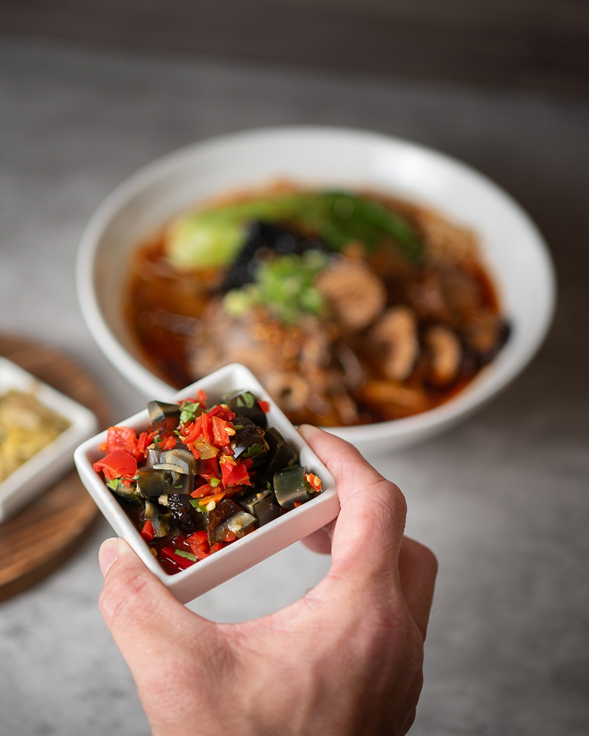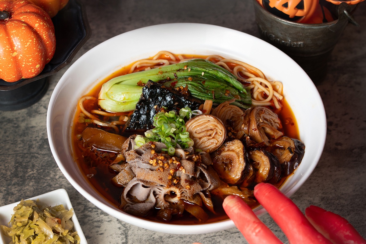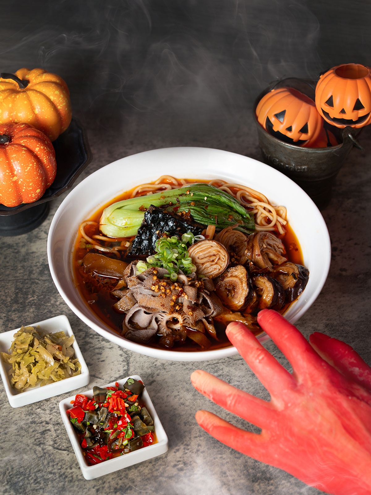La Salle 森酒吧以牛肉麵聞名,這次萬聖節更將台味食材化為驚悚劇本。主廚王銘嘉將牛筋、大腸頭、蜂巢肚、毛肚、牛套腸與豬血糕組合成「開膛破肚牛雜麵」(620 元+10%)。大腸頭入口軟糯、蜂巢肚彈牙、牛筋膠質感十足,加上豬血糕的厚實鹹香,每一口都像在挑戰味蕾的底線。更特別的是自製辣油與「皮蛋香菜剁椒醬」,酸辣鮮香交錯,讓這碗麵在驚悚之餘,味覺層次更顯迷人。