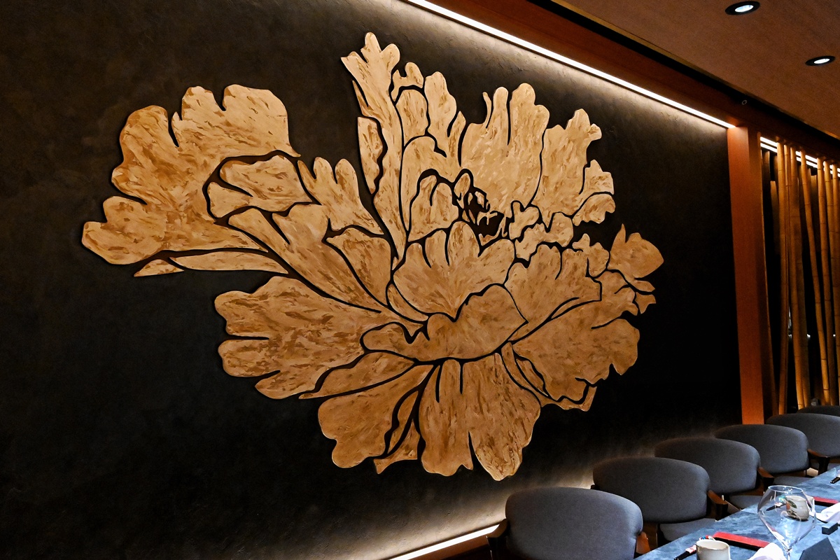 板前區另一偌大牆面以雷射切割木材製成的牡丹花為主題,牡丹素有「萬花之王」之稱,象徵尊貴與華麗。希望每位來店用餐的賓客,都能如天皇、皇后般感受被寵愛的尊榮。
