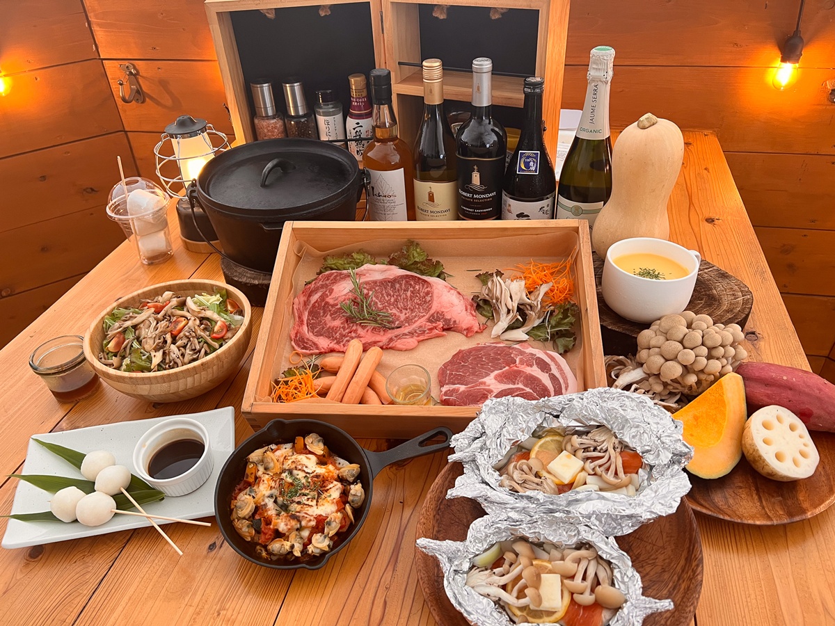 走進群馬白澤的森林秘境,THE FIVE RIVERS FINE GLAMPING 為旅人準備了一場秋日限定的美味饗宴。從赤城和牛、群馬福豚、時令鮭魚到甘甜栗子,每一道料理都凝聚了在地大自然的豐收氣息。更特別的是,館內推出寵物營養師監修的愛犬專屬套餐,讓家人和毛孩在森林裡共享秋季的美味時光,感受住進自然、品味豐饒的野營生活。