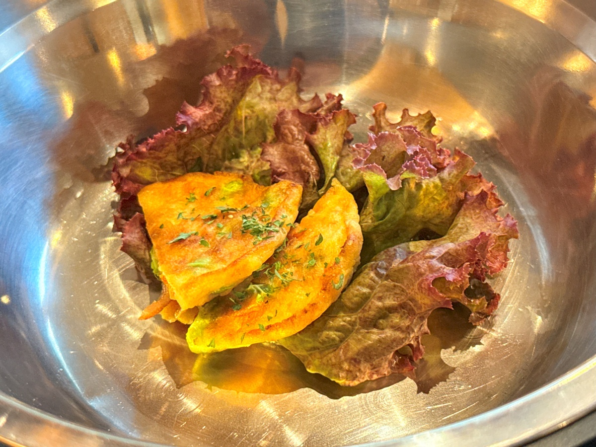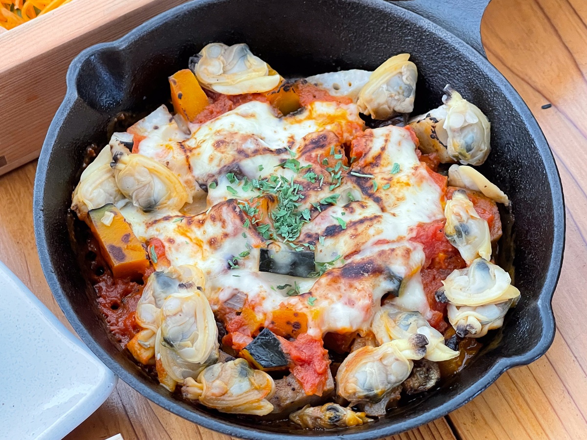 輕輕拌起,還能嚐到微微焦香的鍋巴,讓人忍不住多添一碗。另一亮點是「秋蔬番茄芝士焗烤」,以南瓜與蓮藕為主角,加入番茄與蛤蜊,覆蓋滿滿芝士,在鑄鐵小鍋中焗烤出濃郁香氣。奶香、蔬菜甜味與海味交融,展現野營餐桌的獨特魅力。