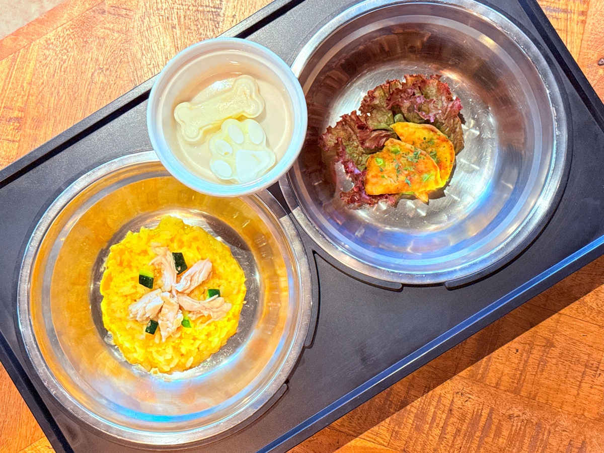 THE FIVE RIVERS 不僅為旅人設計餐桌,也讓毛孩一同融入秋日饗宴。由寵物營養師監修的「愛犬秋季限定餐」以健康與美味兼顧為理念,特別選用南瓜、豆乳、雞胸肉等食材,製成溫潤的南瓜豆乳燉飯,既補充纖維又富含蛋白質,幫助毛孩維持最佳狀態。