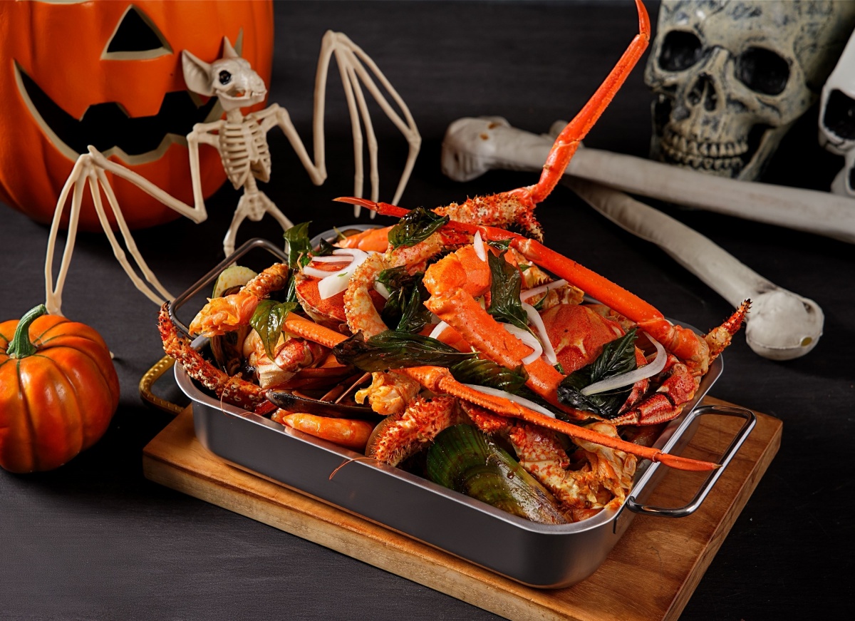 館內超人氣自助百匯化身萬聖搞怪舞台,推出一系列詭譎驚喜的萬聖饗宴。各式豐富應景的鹹食及甜點輪番登場,包含金黃香濃的「南瓜義大利麵」、暗黑深海「墨魚燉飯」、惡魔南瓜盅承裝的「麻婆豆腐腦」,還有造型趣味可愛的「南瓜馬卡龍」與「骷髏頭麵包」等,將萬聖美食與氛圍場景完美呼應,挑戰賓客的視覺與膽量。
