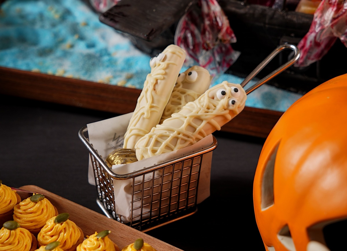 館內精緻糕點小舖同時推出多款萬聖主題甜點及麵包,包含外型驚悚卻藏著玫瑰蔓越莓乳酪的香醇酸甜「惡趣骷髏頭麵包」、暗黑外殼包裹著香濃奶酥內餡的「魔法熔岩波蘿麵包」。充滿獵奇趣味的萬聖節系列甜點還有,香甜繽紛的南瓜系列「馬卡龍」及「蒙布朗」,到創意逼真的「巫婆手指餅乾」、「木乃伊巧克力」,等你壯膽嚐鮮,單品售價65元起。